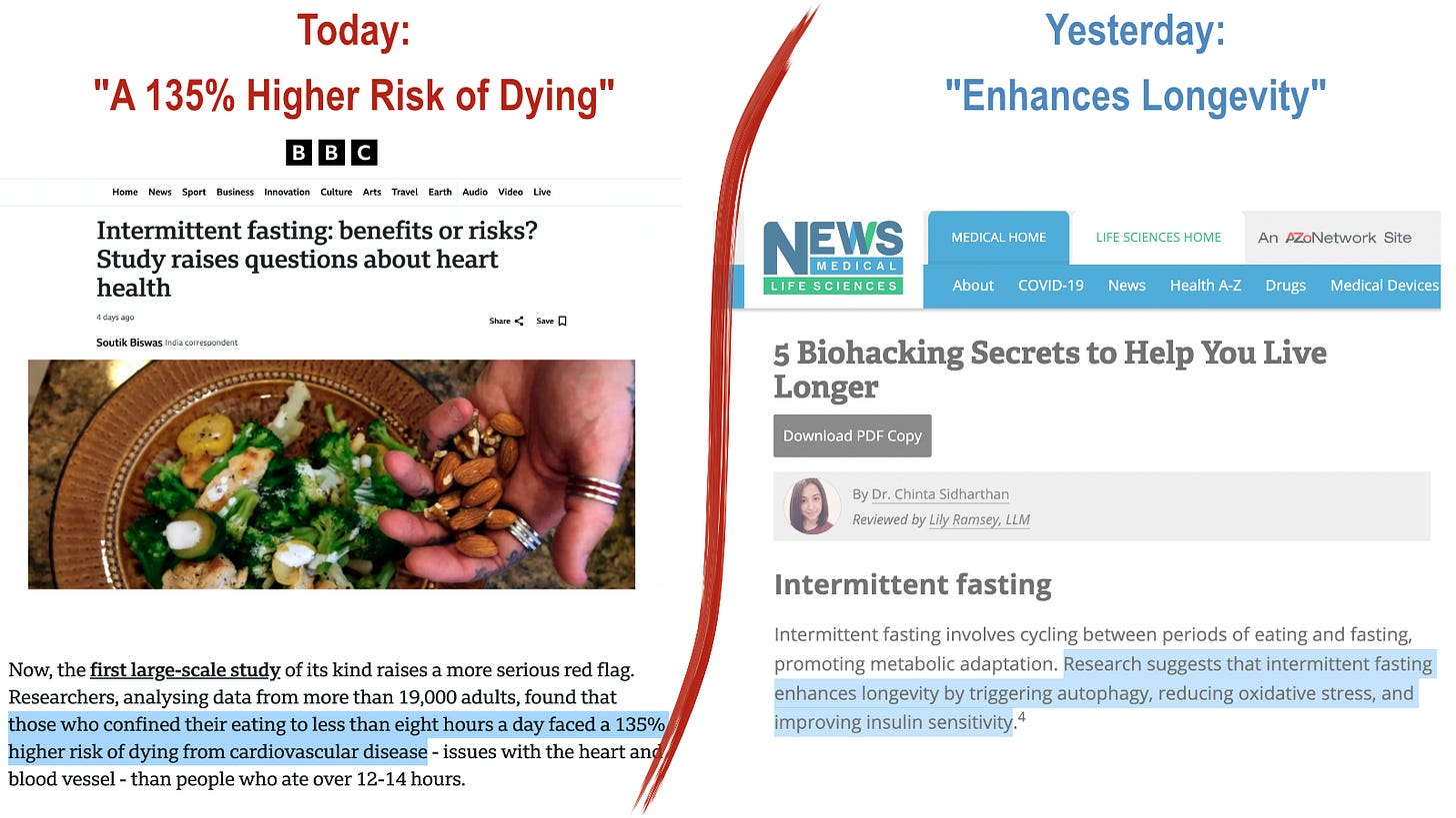 A widely reported observational study linked intermittent fasting (eating in an <8-hour window) to a 135% higher risk of cardiovascular death, challenging years of research that suggested the opposite: substantial health and longevity benefits.