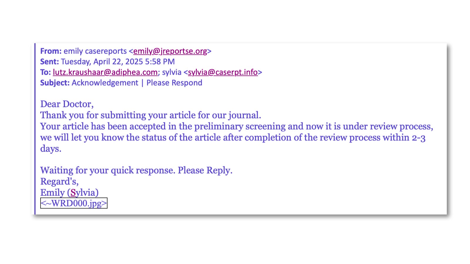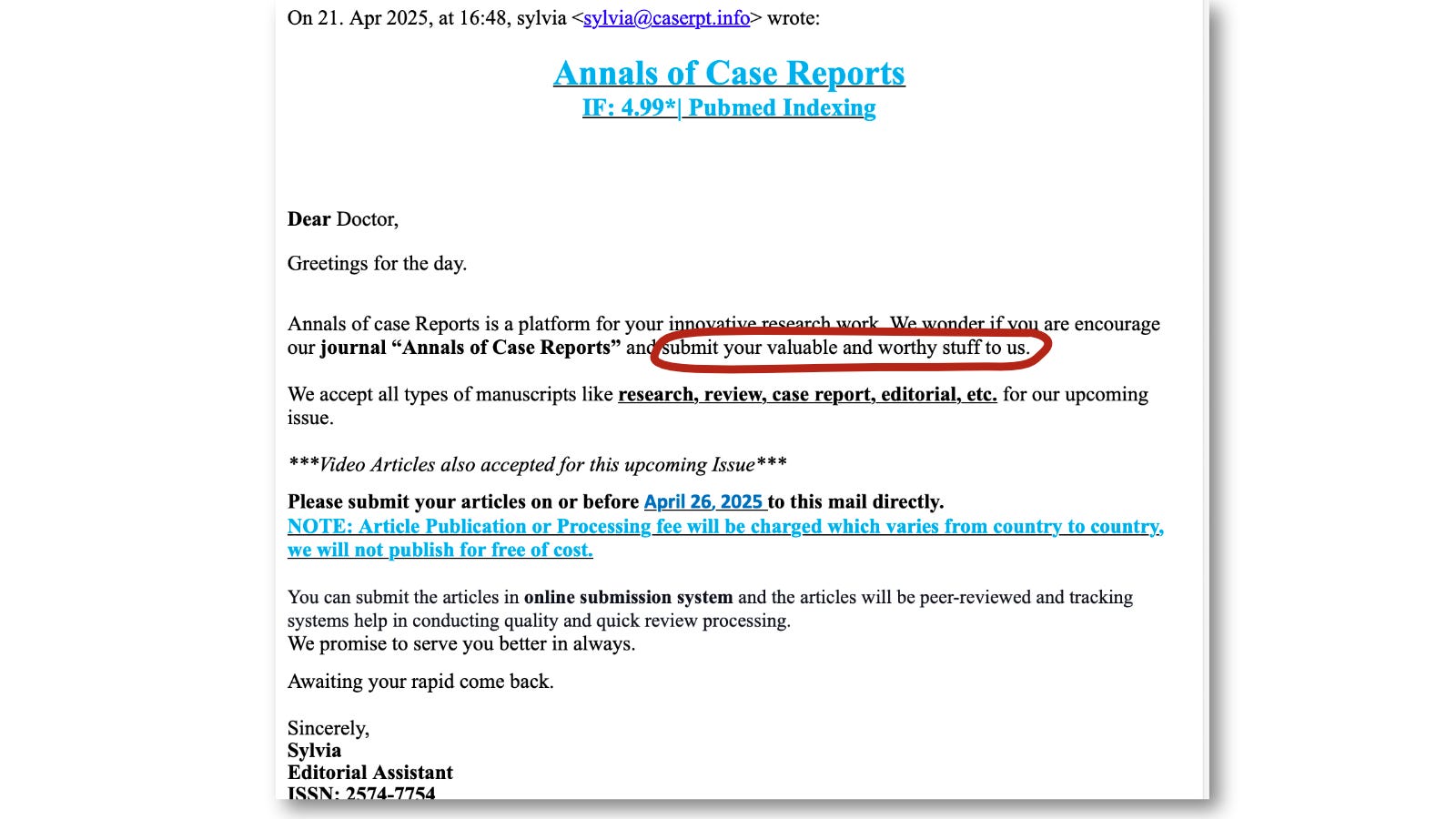 So, yesterday, I tried a new approach. I submitted my “valuable and worthy stuff” to Sylvia, the friendly Editorial Assistant of the Annals of Case Reports.
